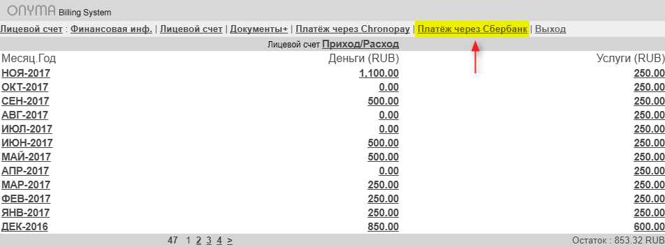 Услуги передачи данных предоставляются при условии их предварительной оплаты. Таким образом, оплата услуг осуществляется путем списания соответствующей суммы с лицевого счета Абонента. Пополнить счет Вы можете в нашем офисе, в Личном кабинете, с функцией «оплаты через Сбербанк», а так же в терминалах ПАО «Сбербанк».